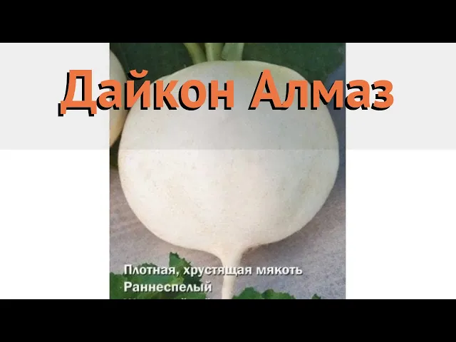 Дайкон «Алмаз» – раннеспелый сорт с коротким вегетационным периодом от всходов до уборки урожая, составляющим 35‑45 дней. Плоды округлые или слегка овальные, гладкие и белые, диаметром 6–10 см, наполовину погружены в почву. Масса одного корнеплода колеблется от 180 до 400 г.