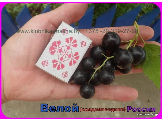 Ягоды крупные (1,6-1,8 г) и очень крупные (более 3,5 г), округлые и плоскоокруглые, черные, среднеблестящие, тонкокожие, с полусухим отрывом, с большим количеством семян (59 шт.) мелкой и средней величины. Плодоножка толстая, средней длины, опушенная. Чашечка небольшая, сомкнутая, полуопадающая. Вкус десертный (5 баллов). Ягоды универсального назначения. Химический состав: растворимые сухие вещества — 18,6%, сумма сахаров — 9,9%, титруемая кислотность — 3,0%, аскорбиновая кислота — 102,7 мг/100 г, Р-активные вещества — 288,5 мг/100 г, пектиновые вещества (на сырую массу) — 0,9%.