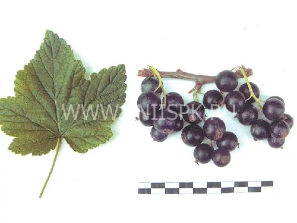 Ягоды крупные (1,3-1,6 г), округлые, черные, с сухим отрывом, со средним количеством семян, кожица толстая. Чашечка закрытая, средняя, неопадающая, плодоножка короткая, зеленая, неопушенная. Вкус кисло-сладкий, с ароматом (4,9 балла). Ягоды универсального назначения. Химический состав: растворимые сухие вещества — 13,7%, сумма сахаров — 10,3%, титруемая кислотность — 2,1%, аскорбиновая кислота — 186,0 мг/100 г.