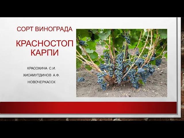 Красностоп Карпи — это новый красный технический сорт винограда, созданный селекцией ВНИИВиВ им. Я.И. Потапенко путём скрещивания сортов Красностоп золотовский и гибрида Августа × амурский. Сорт характеризуется раннесредним или средним сроком созревания с продолжительностью продукционного периода около 128-140 дней. В условиях южных регионов урожай собирают в период с конца августа до середины сентября. Кусты среднерослые, с высокой силой роста, а цветки обоеполые, что способствует хорошему плодоношению. Грозди конические, средней плотности, массой от 210 до 350 грамм, ягоды округлые, темно-синего или почти черного цвета с густым восковым налетом, массой около 1,9-2,1 грамма. Кожица средней толщины, мякоть сочная, с гармоничным вкусом и тонким мускатным оттенком. Сорт отличается высокой сахаристостью сока ягод — от 23 до 28%, при титруемой кислотности 6,5-8 г/л, что обеспечивает насыщенный и полный вкус виноматериала. Вина из Красностопа Карпи имеют темно-рубиновый цвет и выраженный аромат с тонами черной смородины, вишни, а также мускатными и шоколадными нотками, что придает им приятное и долгое послевкусие. Дегустационная оценка сухого виноматериала достигает 8,6 баллов, что свидетельствует о высоком качестве получаемого продукта. Красностоп Карпи обладает высокой зимостойкостью и морозоустойчивостью до -25°С, что делает его пригодным для выращивания в различных климатических условиях. Сорт устойчив к основным грибным заболеваниям, включая милдью, оидиум и серую гниль, что снижает необходимость в интенсивной защите растений. Благодаря высокой урожайности и комплексной устойчивости к болезням, этот сорт рекомендуется для виноделия, а также для выращивания на сильнорослых подвоях в неукрывной культуре.