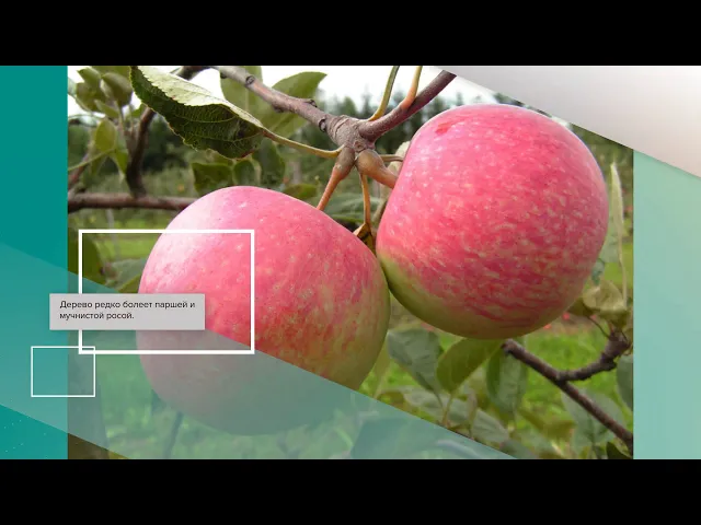 Достоинства сорта: хорошая зимостойкость, крупные высокотоварные, одномерные, транспортабельные плоды десертного вкуса, высокая устойчивость к парше.