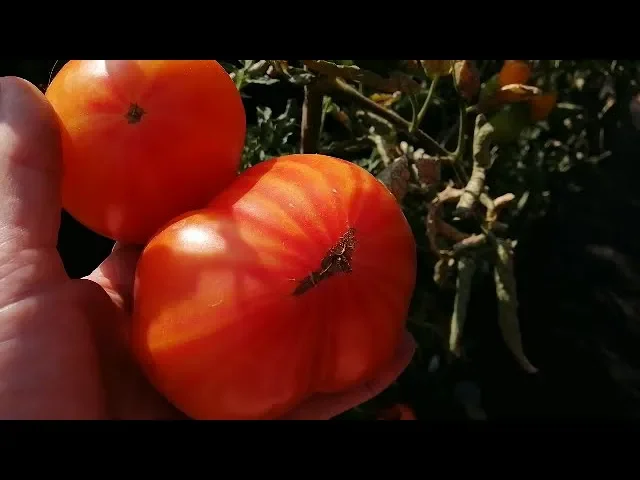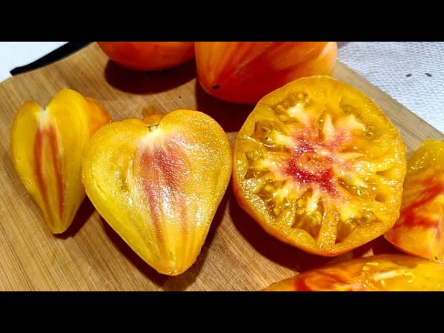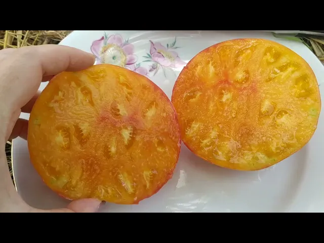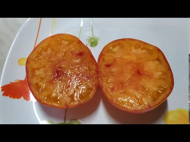 Плоды томата крупные, весом от 250 до 800 грамм, имеют коническую или сердцевидную форму с ярко выраженной биколорной окраской: основной цвет — насыщенный жёлтый с малиновым румянцем, покрывающим значительную часть плода. В технической спелости плоды салатового цвета, а в биологической приобретают жёлто-оранжевый оттенок с малиновой «звездой» на вершине. Мякоть отличается яркостью и насыщенностью цвета, с темно-красным оттенком в разрезе, а вкус — сладкий с пряными нотками и лёгкой кислинкой, что делает томаты особенно привлекательными для употребления в свежем виде.