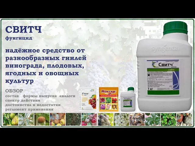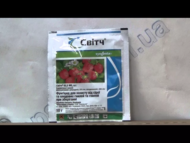 Свитч 62,5 WG в.г. — фунгицид для защиты земляники от серой гнили и других болезней. Препарат содержит два действующие вещества: флудиоксонил и ципродынил, обеспечивая этим двойное влияние на возбудителя болезни, а также надёжная защита растения. Свитч 62,5 WG в.г. владеет контактно-проникающей и профилактично-искореняющим действием, поэтому защищает растение на четырёх этапах развития возбудителя болезни: при прорастании конидий, в начале роста мицелия патогена, при проникновении патогена в клетки и останавливает рост милецея в клетки. Препарат имеет высокую эффективность против разных видов гнилей винограда. Лечебное действие составляет 2 дня, а защитная — 10-12 дней. Безопасный для пчёл, полезных насекомых и окружающей среду. Малотоксичный, безопасный для людей (ЛД50 > 3000 мг/кг).