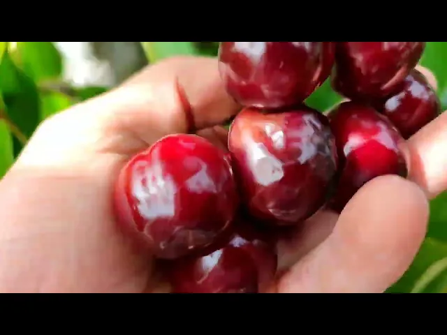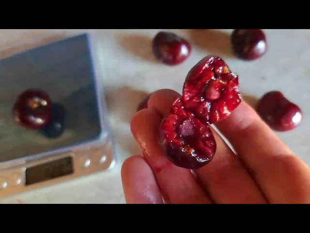 Плод крупный, средняя масса 3,3 г, максимальная 3,5 г, величина 1,6 х 1,3 х 1,4 см. Форма плода удлиненно-овальная, с округлой вершиной и округлым основанием с глубокой воронкой, брюшной шов в виде полоски. Окраска плода темно-бордовая, кожица опушена короткими, еле заметными волосками. Мякоть красная, хрящеватая, плотная, сочная. Окраска сока красная. Длина плодоножки 0,5 см, средней толщины, опушена. Полусухой отрыв плодов. Косточка 0,17 г, составляет 5,2% от массы плода, не отделяется от мякоти.
