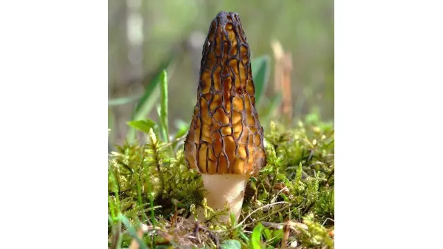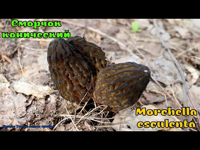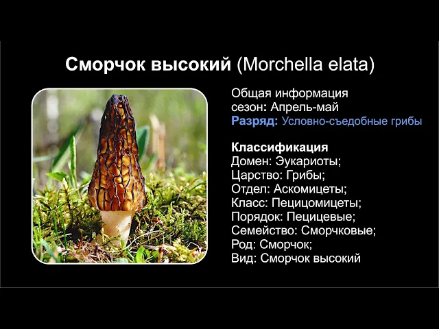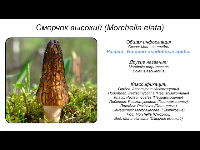 Сморчок высокий / Morchella elata — съедобный гриб рода сморчков семейства сморчковых. Внешне сморчок высокий очень похож на сморчок конический. Отличается более тёмным цветом и более крупными размерами плодового тела (апотеция) (5-15 см, до 25-30 см высотой). Шляпковидная часть узкая, коническая, 4-10 высотой и 3-5 см шириной. Поверхность покрыта примерно треугольными ячейками, ограниченными более или менее параллельными вертикальными узкими складками. Ячейки оливково-коричневые, у зрелых грибов — бурые или чёрно-коричневые; перегородки бывают оливково-охряные; окраска гриба с возрастом темнеет. Ножковидная часть гриба цилиндрическая, зернистая, 5-15 см высотой и 3-4 см толщиной, на вершине по диаметру почти равна шляпке. У молодых грибов ножка беловатая, позже — желтоватая или охряная.