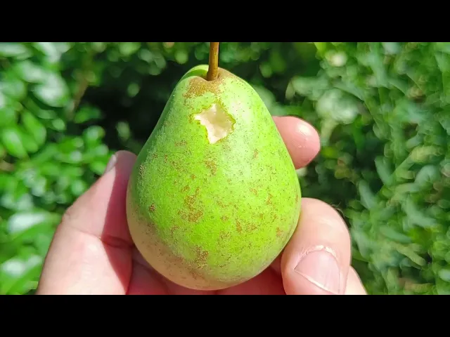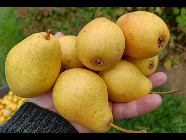 Плоды среднего размера, массой 120-140 г, обратнояйцевидной или грушевидной формы, поверхность гладкая. Кожица тонкая, гладкая, матовая, сухая. Основная окраска желто-зеленая. Покровная окраска отсутствует или очень слабо выражена в виде размытого розового румянца. Подкожные точки мелкие, средневыраженные. Оржавленность слабая, нежная. Плодоножка короткая, средней толщины. Воронка мелкая, узкая, ребристая. Блюдце мелкое, узкое, бугристое. Чашечка открытая. Подчашечная трубка средней величины. Осевая полость плода средняя. Сердечко широкоовальное, небольшое, грануляций нет. Число семян в плоде среднее (5-10 шт. ), семена средней величины, коричневые.