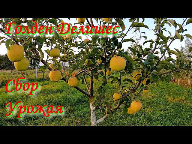 Яблоня сорта Golden Delicious — это высокоурожайный зимний сорт, выведенный в США в 1890 году и ставший одним из самых популярных в мире. Деревья среднерослые, достигают высоты 3-5 метров, с густой кроной, которая у молодых растений имеет конусообразную форму, а у взрослых становится широкоокруглой или напоминает плакучую иву. Кора ствола и ветвей гладкая с бурым оттенком, листья крупные, овальные, зеленые и блестящие. Цветение происходит в конце апреля — начале мая, цветки крупные, белые или розовые, с приятным ароматом, собраны в кисти по 3-5 штук. Плоды Golden Delicious крупные, округло-конические, весом около 180-200 грамм, с гладкой, сухой и слегка шероховатой кожицей золотисто-желтого цвета с зеленоватыми вкраплениями и иногда с размытым красноватым румянцем на солнечной стороне. Мякоть яблок плотная, сочная, сладкая с легкой кислинкой, при хранении становится кремовой или светло-желтой, нежной и десертной по вкусу. Съемная зрелость наступает в конце сентября, а потребительская — в январе, при этом плоды могут храниться до апреля, сохраняя свои вкусовые качества и внешний вид. Яблоки не опадают с ветвей даже в период зрелости, что облегчает сбор урожая. Сорт отличается высокой устойчивостью к парше, средней устойчивостью к бурой пятнистости и засухе, а также морозоустойчивостью. Яблоня Golden Delicious начинает плодоносить на третий год после посадки, при этом регулярное плодоношение сохраняется первые годы, а с 8-10 лет урожайность может достигать 45-60 кг с дерева в зависимости от региона и условий выращивания. Сорт самобесплоден, для опыления рекомендуется использовать сорта Джонатан и Делишес Спур. Благодаря своим высокопродуктивным и десертным качествам, а также хорошей устойчивости к болезням, Golden Delicious широко применяется в промышленном садоводстве и селекции.